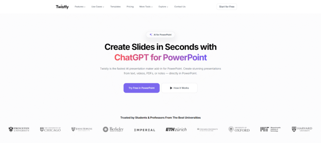 Twistly is the fastest AI add-in natively made for PowerPoint. It particularly appeals to students, teachers, and other education professionals who want to craft professional presentations fast. Twistly works inside Microsoft PowerPoint and uses ChatGPT to create slides from a single prompt, text, video or files.
