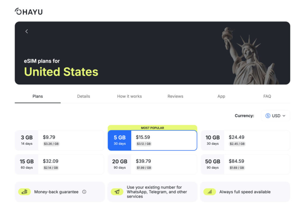 I chose a 2GB USA plan for around USD 8 ahead of a three-day trip to Boston. The purchase and activation were smooth, and the step-by-step guide made setup stress-free.