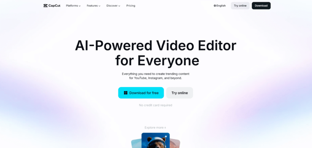 AI here is very shortcut-oriented: auto-captions, background removal, filters, and lots of trending templates. If you’re still figuring out how to make YouTube videos and don’t want to get lost in menus, CapCut lets you combine clips, text, and music and export without overthinking.