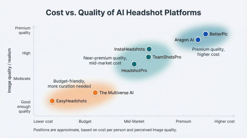 - EasyHeadshots and The Multiverse AI win on price, yet you trade some consistency and must spend time curating the best frames.
