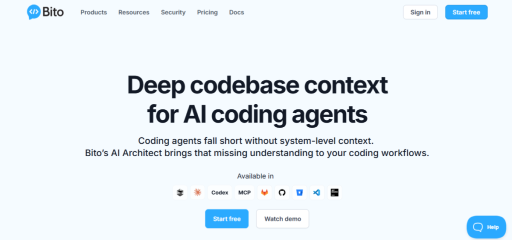 Bito AIDeep, full-codebase analysisIt understands logic across files IDEs, GitHub, PRsLarge teams, complex repos, security-focused devs