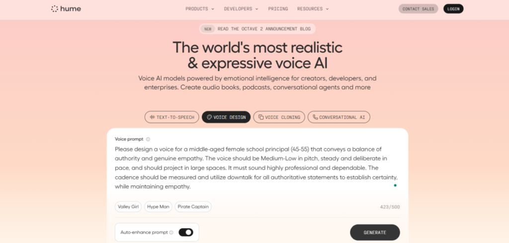 This involves curating custom synthetic voices via text prompts that specify tone, personality, emotion, accent, cadence, vocal identity, and style. Octave is responsible for effectively interpreting those descriptions into text. Generated voices can be saved and reused multiple times.