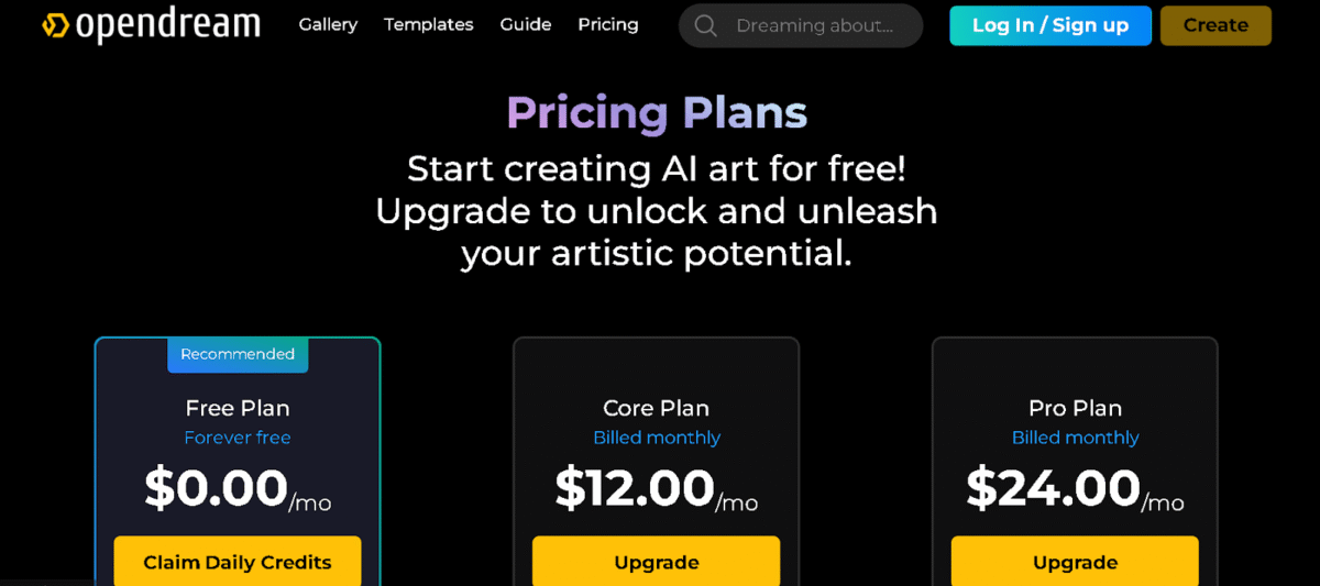 • Free Plan: $0/month, includes limited access with 24 daily credits to generate AI images using two models (Dreamlike Photoreal 2.0 and Dreamlike Anime 1.0).