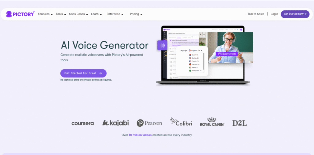 Pictory offers AI voiceovers in multiple accents and languages.