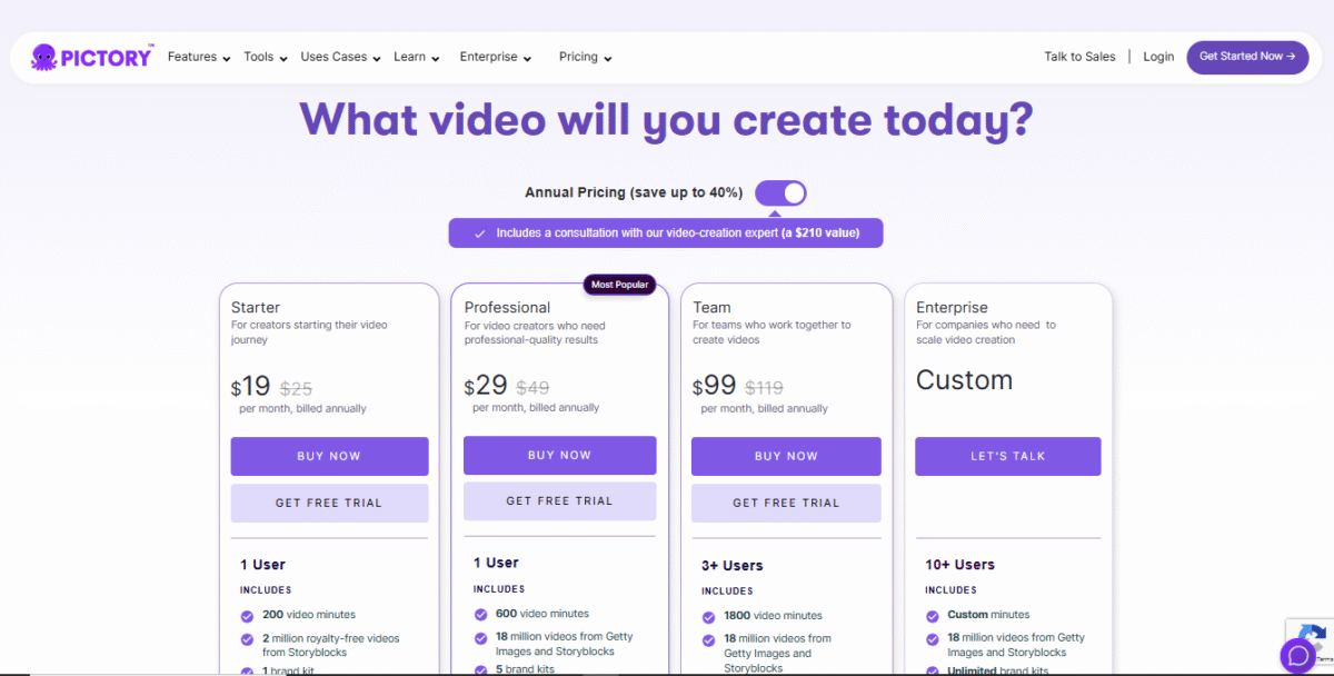 • Pictory’s pricing plans are flexible, with options that work for beginners as well as growing teams.
