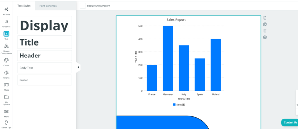 One thing I really did like was the availability of an ample amount of editing tools. I could easily add a bar chart to present information, add images, include text and logos, and splatter on a color theme (even brand colors). While the color theme options were basic and limited at best, the allowance of brand colors mitigated the restriction.