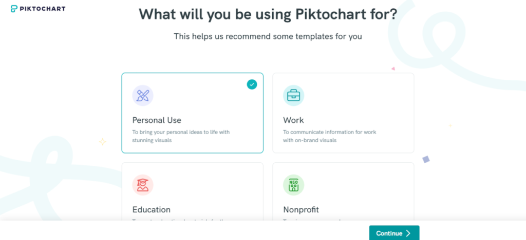 You will need to create an account using an email address. Then, Piktochart will ask about your purpose of using Piktochart to make template recommendations.