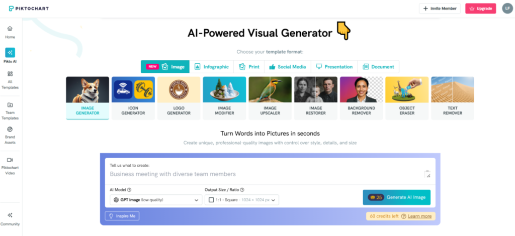 Picktochart’s AI can restore images, remove backgrounds, erase elements, and upscale images. Then, there’s its ability to create custom infographics, prints, social media posts, presentations, and document layouts.