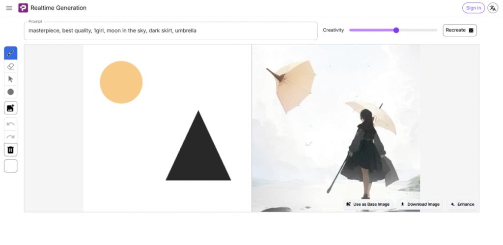 One of Pix AI’s most innovative tools is Realtime Generation, which transforms simple shapes or sketches into full, detailed images instantly.
