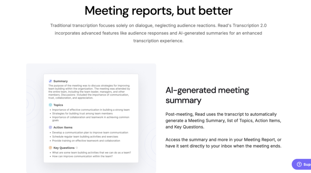 After a call ends, Read AI doesn’t just give you a rough transcript. It produces a clean summary, highlights action items, and identifies key moments.