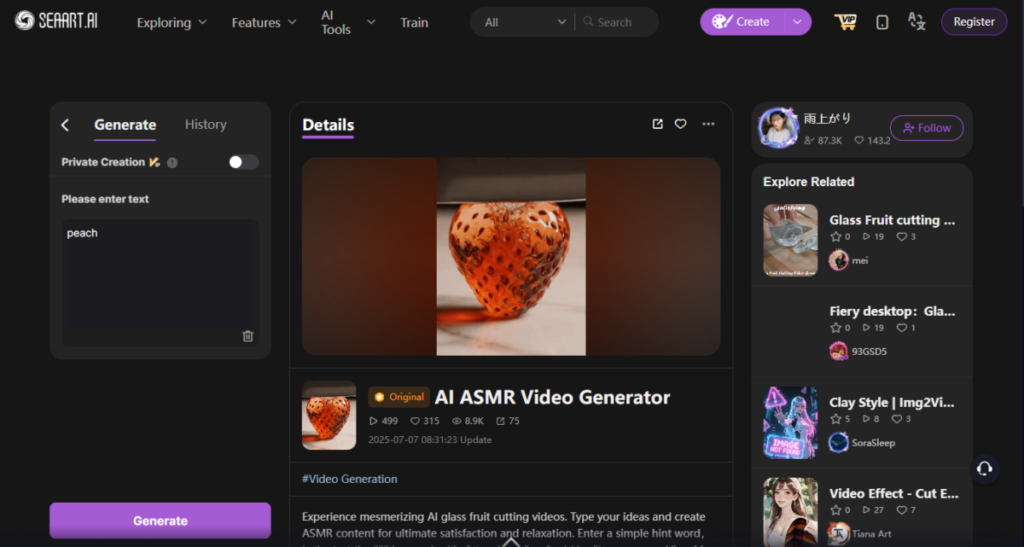 SeaArt can produce ASMR-style videos using AI-generated audio and visuals.
