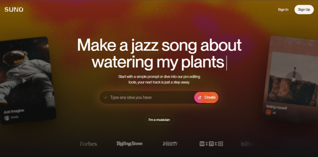 Suno AI is one of the most popular names in AI music. It’s famous for combining realistic vocals with great-sounding instruments, and it’s perfect for making demo tracks or even social media content.