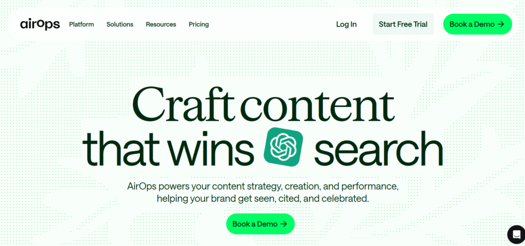AirOps automates and scales content creation. It connects AI models, structured data, and internal workflows to generate large volumes of programmatic SEO content. This translates to an easier path of creating landing pages and product descriptions without sacrificing quality standards.