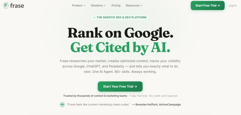 - Frase generates detailed SEO content briefs from search results.
