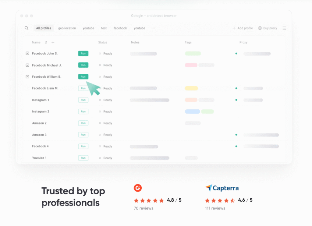 Antidetect browser GoLogin leads the 2025 field for its balance of security, collaboration, and usability. Originally built for privacy professionals, it’s now the go-to anti-detect browser for e-commerce and marketing teams managing hundreds of online profiles.