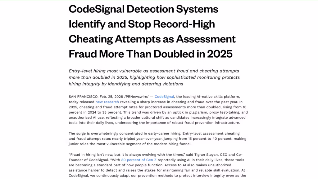 Entry-level hiring was hit hardest, with a 40% cheating attempt rate. Those numbers are striking, and they explain why CodeSignal has invested heavily in detection.
