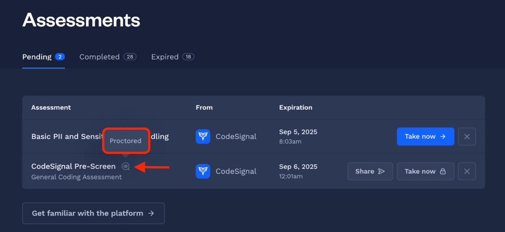 You will always know before you start whether proctoring is required because CodeSignal displays this information in your Assessment section ahead of time.