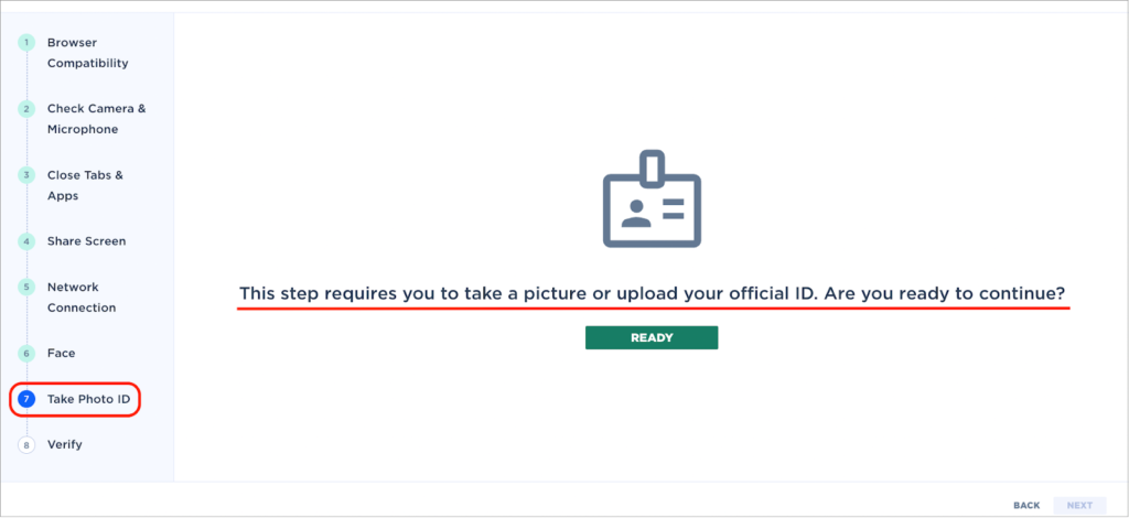 Before the timer starts, the platform prompts you to share your camera, microphone, and screen. It also asks you to show a government-issued photo ID to verify your identity.