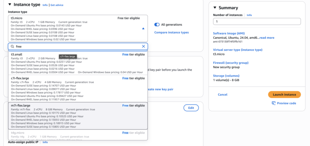 In the search box, type “free” to filter only free tier options