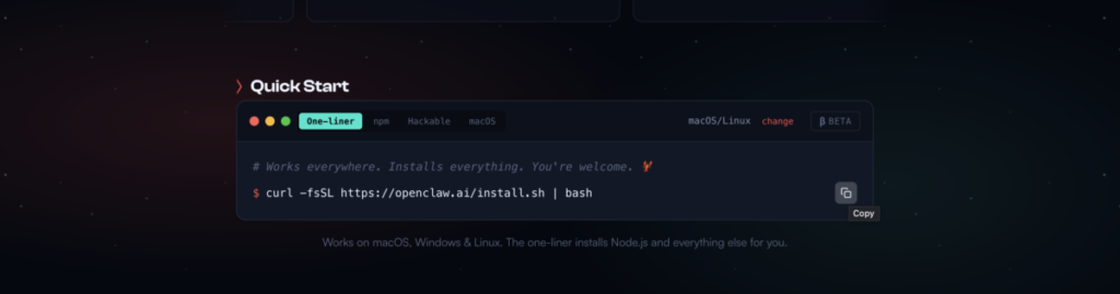 Copy this single line: curl -fsSL https://openclaw.ai/install.sh | bash