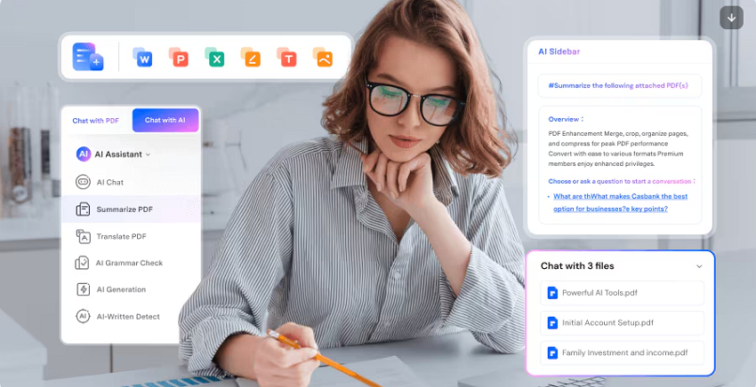 With PDFelement, you can open your PDF directly and generate summaries instantly. The AI analyzes the entire document and extracts key points, making it ideal for long reports, contracts, or academic papers. It also supports multiple formats and lets you edit, annotate, and organize PDFs in one place.