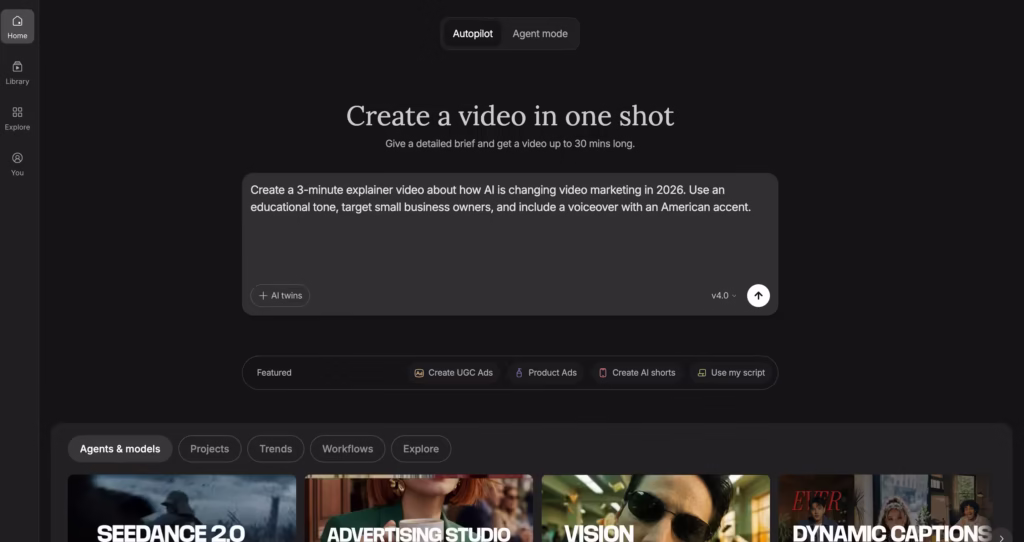 When you enter a prompt, the AI writes a full script, selects or generates visuals scene by scene, records a voiceover, adds subtitles, picks background music, handles pacing, and assembles everything into a cohesive multi-minute video.