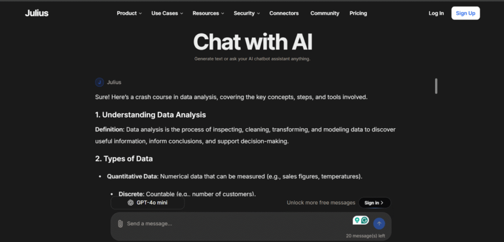The Julius AI chat functions just like any chatbot. Just feed it detailed text prompts, and it will generate outputs that adhere to the prompt. I asked Julius AI chat to give me a crash course in data analysis, and it did that effectively.