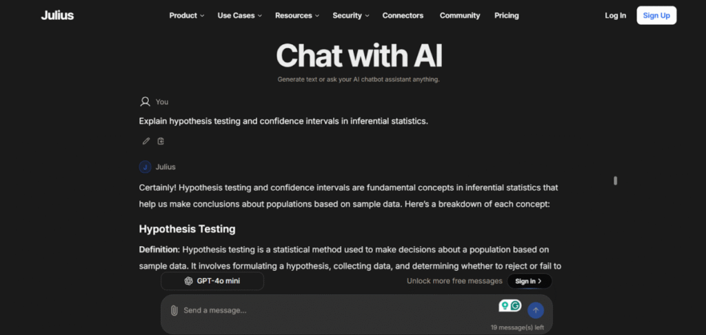 I asked Julius AI chat to elaborate on certain concepts (hypothesis testing and confidence interval) that it had mentioned in its earlier response. It returned step-by-step processes and practical examples.