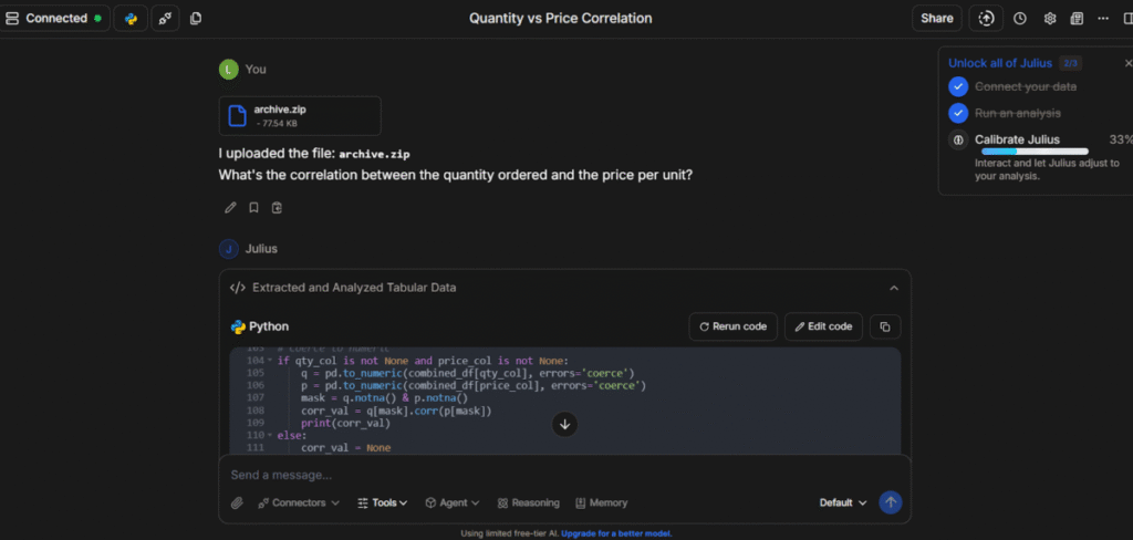 Essentially, I put the tool in the driver’s seat and asked it to take the initiative and extract every possible value. Julius AI proceeded to generate code, explain it, and clean the data.