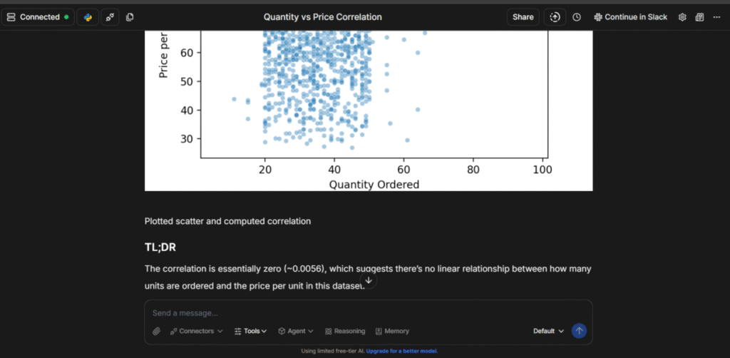 Just like the main tool, the chat feature can be fed with datasets, then asked in natural language for insights. I uploaded a sample dataset containing sales figures and requested a correlation analysis between two variables.