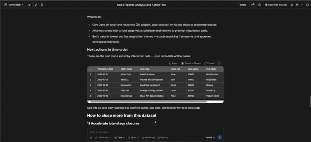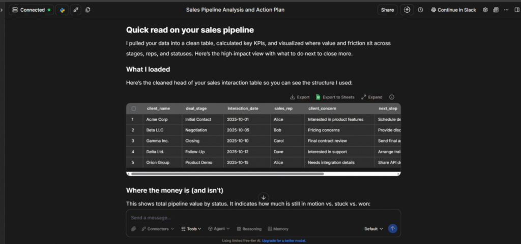 After this, it gave me a quick rundown of the fictional company’s sales pipeline and money entry points