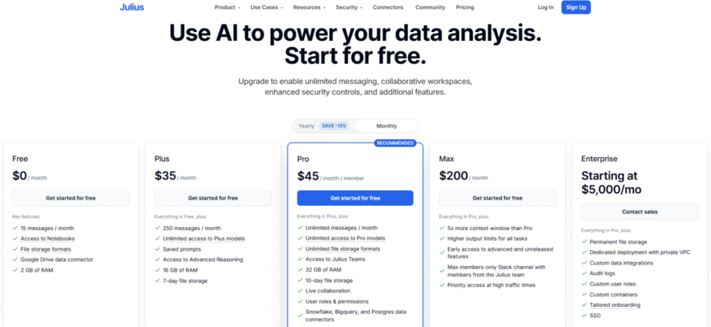 Currently, Julius AI offers four paid plans: Plus, Pro, Max, and Enterprise. The plans are available on both monthly and yearly billing cycles, but the yearly billing plan comes with a 15% discount.