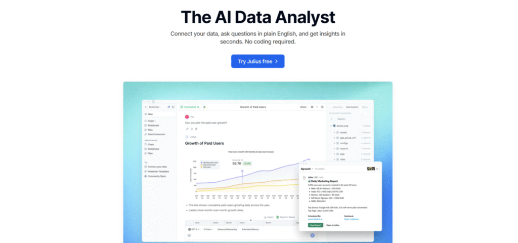 Julius AI has emerged as one of the top tools for data analysis. It is an intelligent GPT-based data workspace that receives data from spreadsheets and databases to provide insights and visualizations. It operates a no-code, natural language interface to encourage non-technical users.