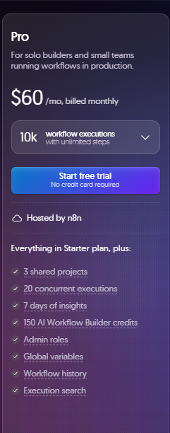 | Pro | $60/month | About 10,000/month | n8n Cloud | Small teams |