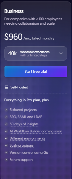At around $960 per month when billed monthly, it includes approximately 40,000 workflow executions per month, along with a stronger set of governance and collaboration features.