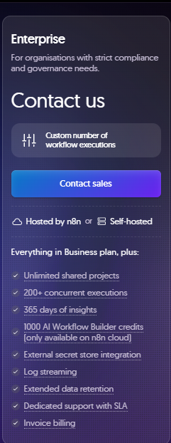 The pricing of this plan is custom and requires contacting n8n’s sales team, with execution limits tailored specifically to your organization’s needs.
