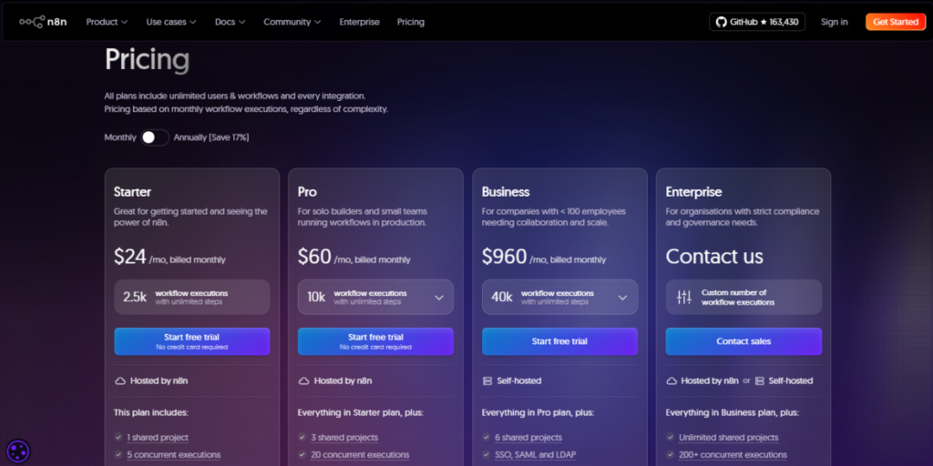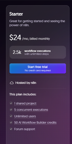 | Starter | $24/month | About 2,500/month | n8n Cloud | Solo builders & hobbyists |