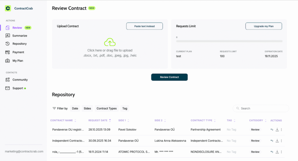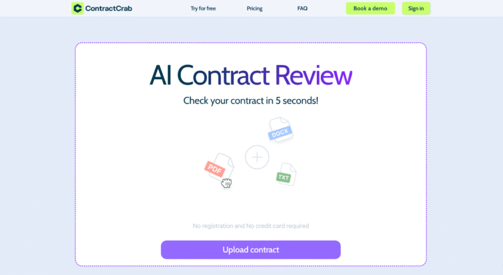 - C.T uploads their contract into ContractCrab in PDF, DOCX, or TXT. They can also review contracts in bulk if they have multiple agreements to review.