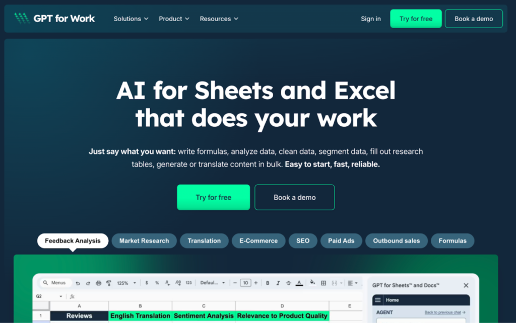GPT for Work is an AI-powered add-on for Google Sheets, Excel, Google Docs, and Microsoft Word that lets users run custom AI prompts across thousands of rows at scale. It supports multiple AI models and is built for bulk data processing, making it one of the most versatile Excel AI tools available. It uses a pay-as-you-go credit system with packs starting at $29.