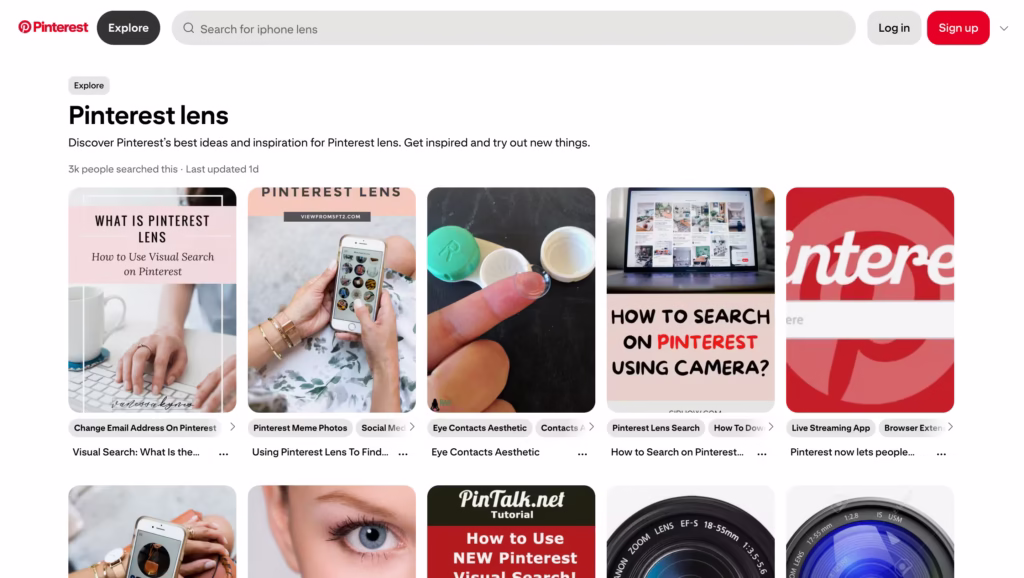Pinterest Lens lets you search for visually similar content within Pinterest’s massive image library. On mobile, you can even point your camera at something physical and find matching pins instantly.