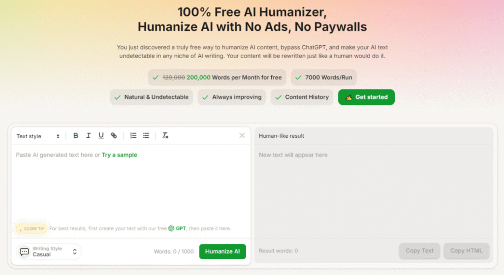 If you want to make AI content undetectable for free, then check out Humanize.io. This platform allows any user to rewrite AI content to sound more human-like at no charge. It doesn’t even have any word limits, so you can handle bulk content tasks easily. For this reason, it can cater well to budget-limited users like students or freelancers.