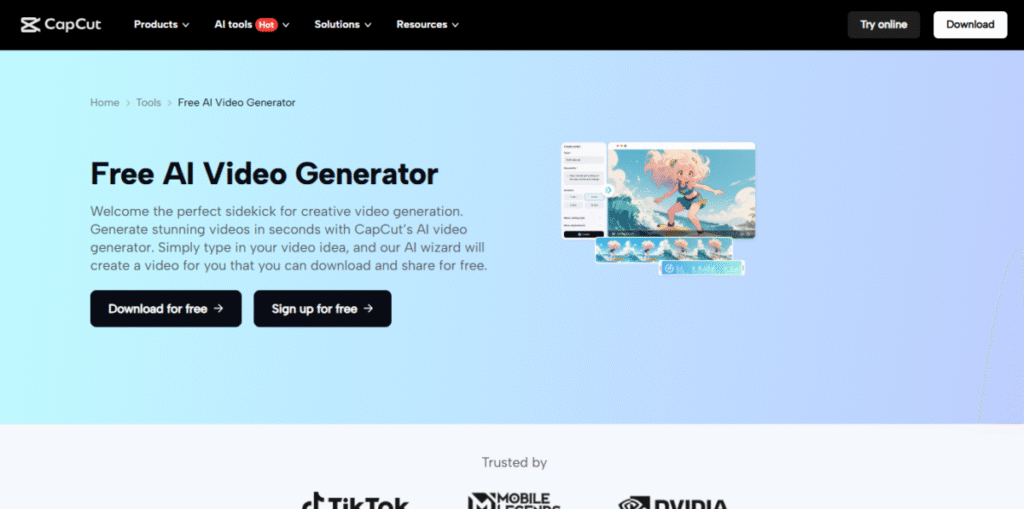 If there’s one name that dominates short-form video editing, it’s CapCut. Created by ByteDance, the parent company of TikTok, this AI video editor is designed for creators who live and breathe fast, engaging content.