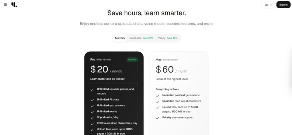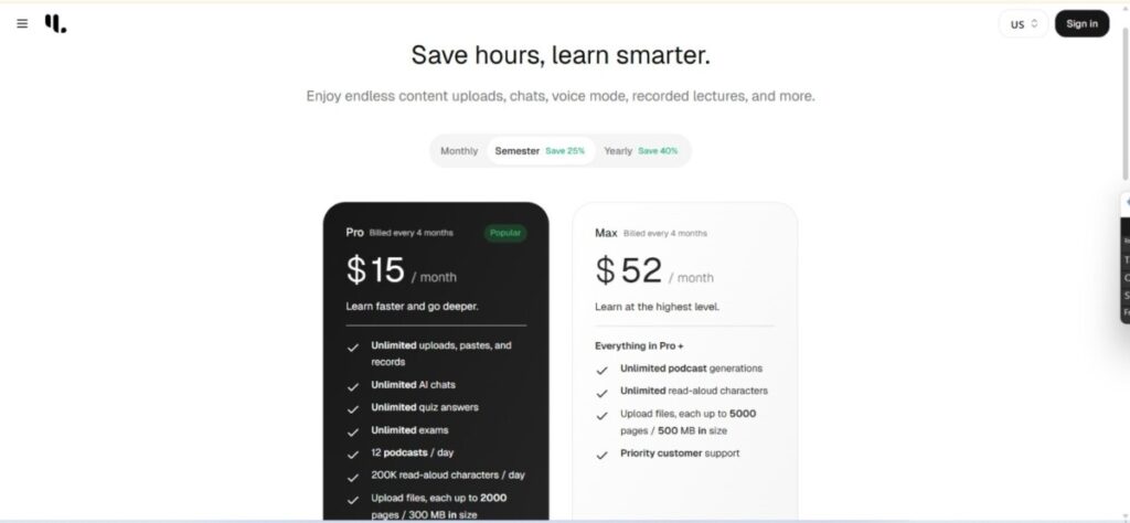 | Pro | $12 – $20/month($12/month billed annually) | Unlimited uploads, pastes, and records Unlimited AI chats Unlimited quiz answers Unlimited exams 12 podcasts / day 200K read-aloud characters / day Upload files, each up to 2000 pages / 300 MB in size Anki export |